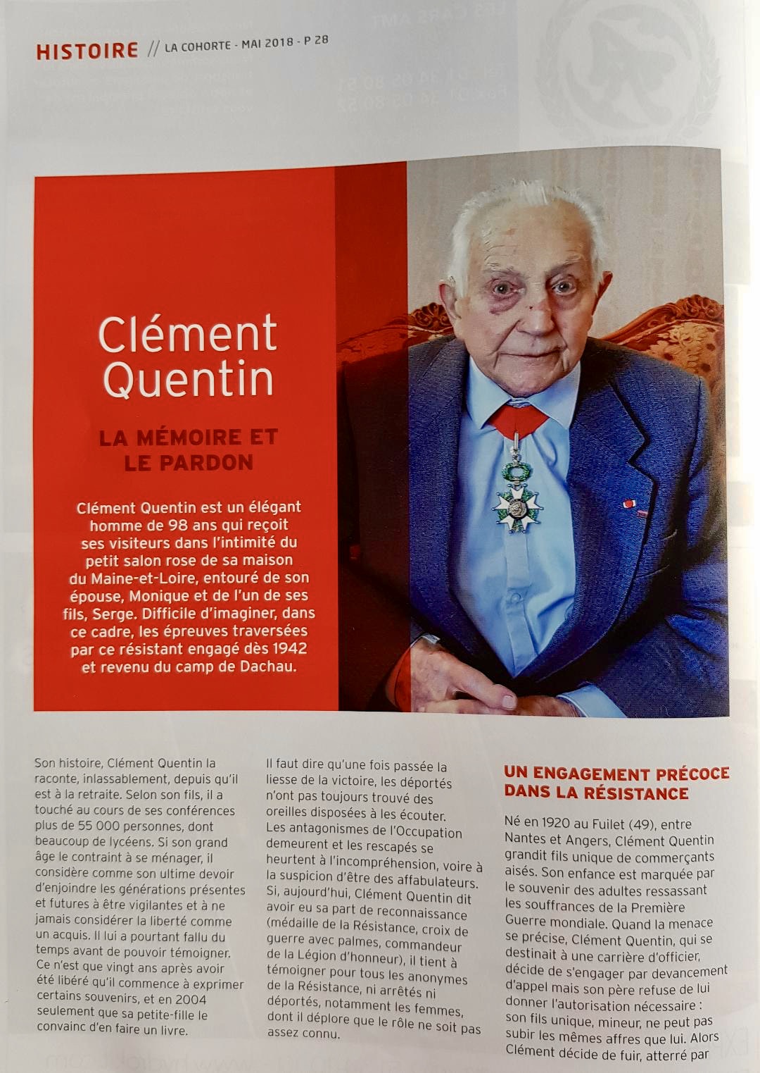 3. Voici une Légion d’Honneur amplement méritée ! Monsieur Clément Quentin est un héros dans le vrai sens du terme ; il nous donne une leçon de courage et on ne peut que remercier cet Homme pour ce long parcours de résistant . Comment peut-il pardonner toutes ces atrocités ? Quelle leçon de mémoire pour les générations futures ! Merci , Monsieur Quentin de nous avoir confié tous ces souvenirs si émouvants …